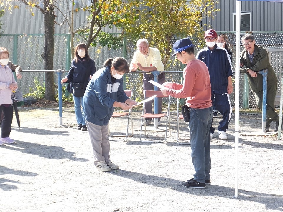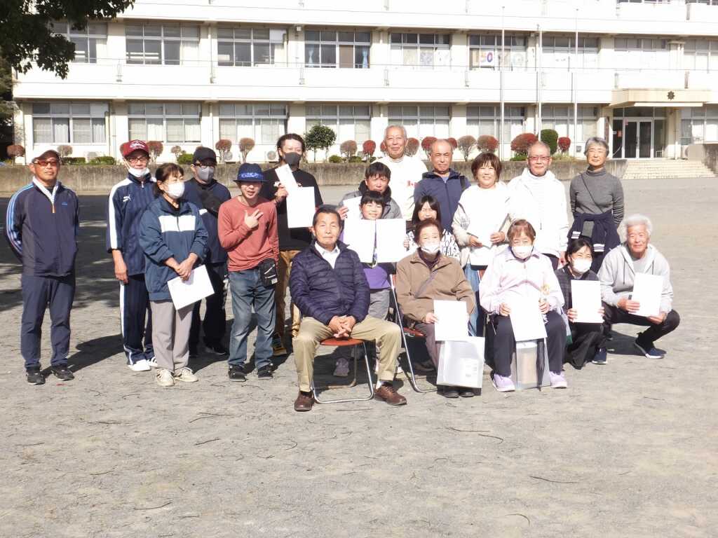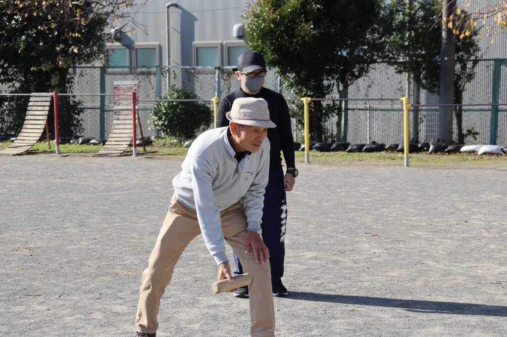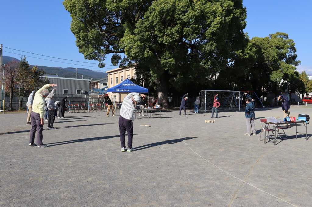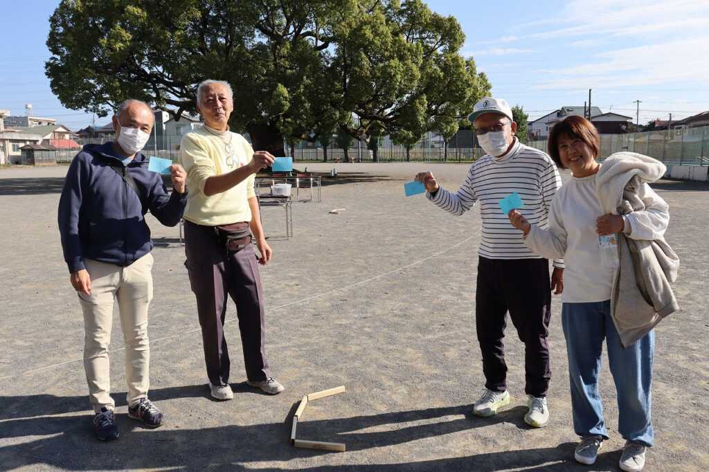 | 秋晴れの空の下、岡本小学校のグラウンドでモルック大会が開催されました。円になって入念に準備運動を行った後、初めてモルックに触れる参加者もいた為、モルック部の方が中心となってルール説明が行われました。その後、スキットルを投げる練習を挟んで、さっそく4チームに分かれて試合をしました。残り10点で勝ちとなる場面で1本倒しで10点ピッタリをとるナイスプレーも見られ、他の参加者から大きな拍手が贈られました。 (お写真の一部は、秋山副自治会長よりいただきました。) |