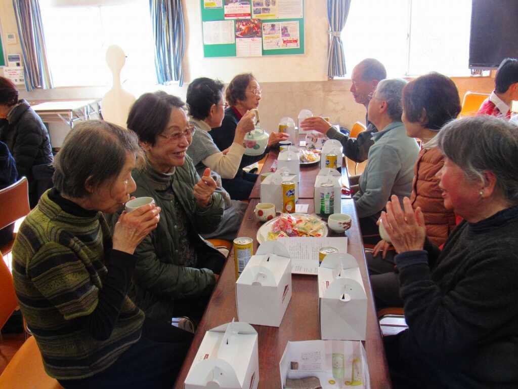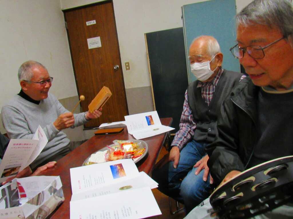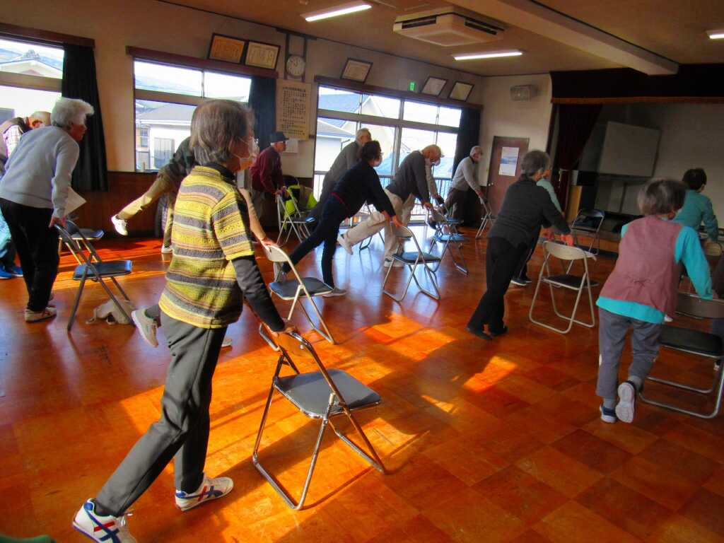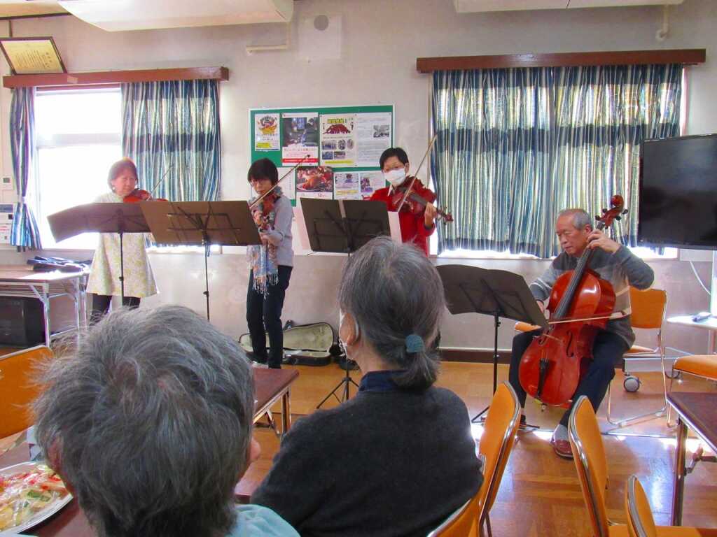 | 寒さが増してきたため、体操の始めに「自分で散歩をする時にも、ストレッチをしましょう」と伝えられ、ストレッチの紹介がありました。体操の後には、「アンサンブルゆう」による弦楽四重奏が披露され、優雅な音楽に耳を傾けました。参加者も一緒に歌ったり、楽器を鳴らしたりして盛り上がり、アンコールは2回も。音楽を楽しんだ後は、お茶会で交流をして今年の集まりを締めくくりました。 年明け初めての体操は1月9日(金)の開催です。来年も元気に体操をしましょう。ぜひご参加ください。 |